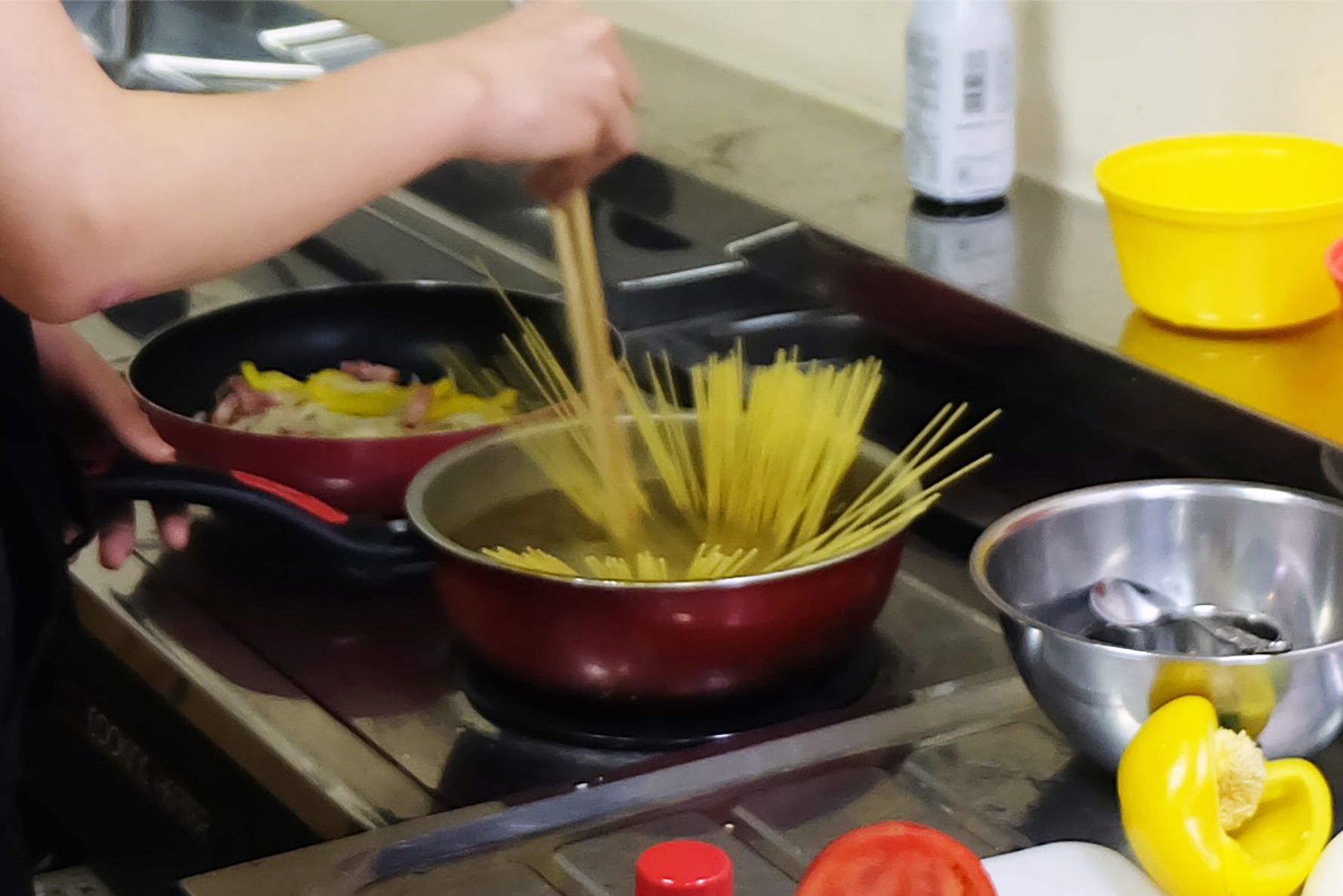 お湯を沸かしながら、他方では材料を切り、並行して炒めている。