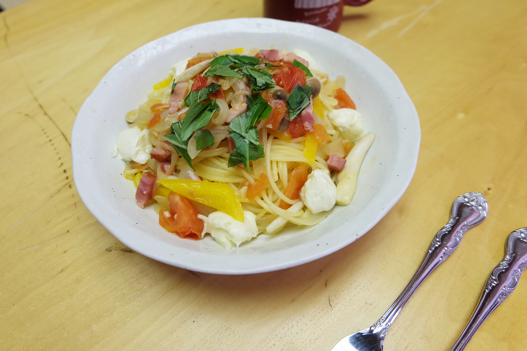 作ってもらったものは「ベーコンとしめじのトマトパスタ」。