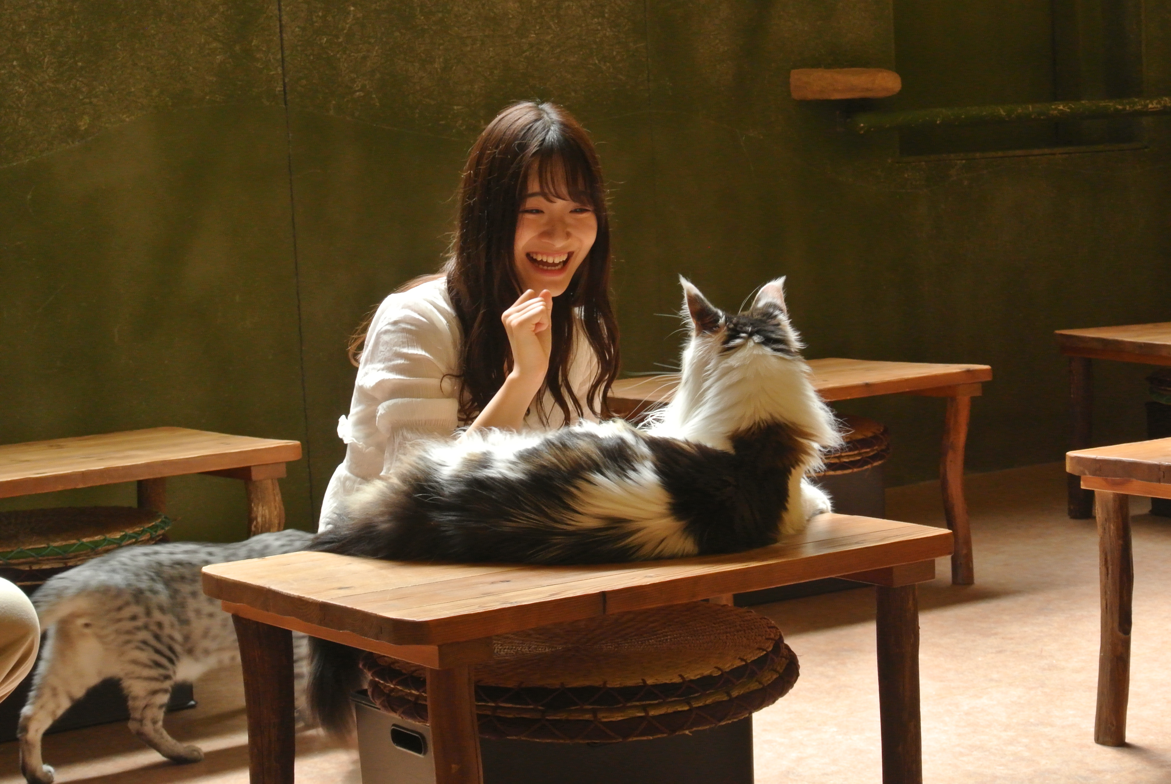 猫カフェに入ってすぐに猫に夢中になる日高さん。ケータイを片手に終始猫と戯れる様子に撮影陣もほっこり。