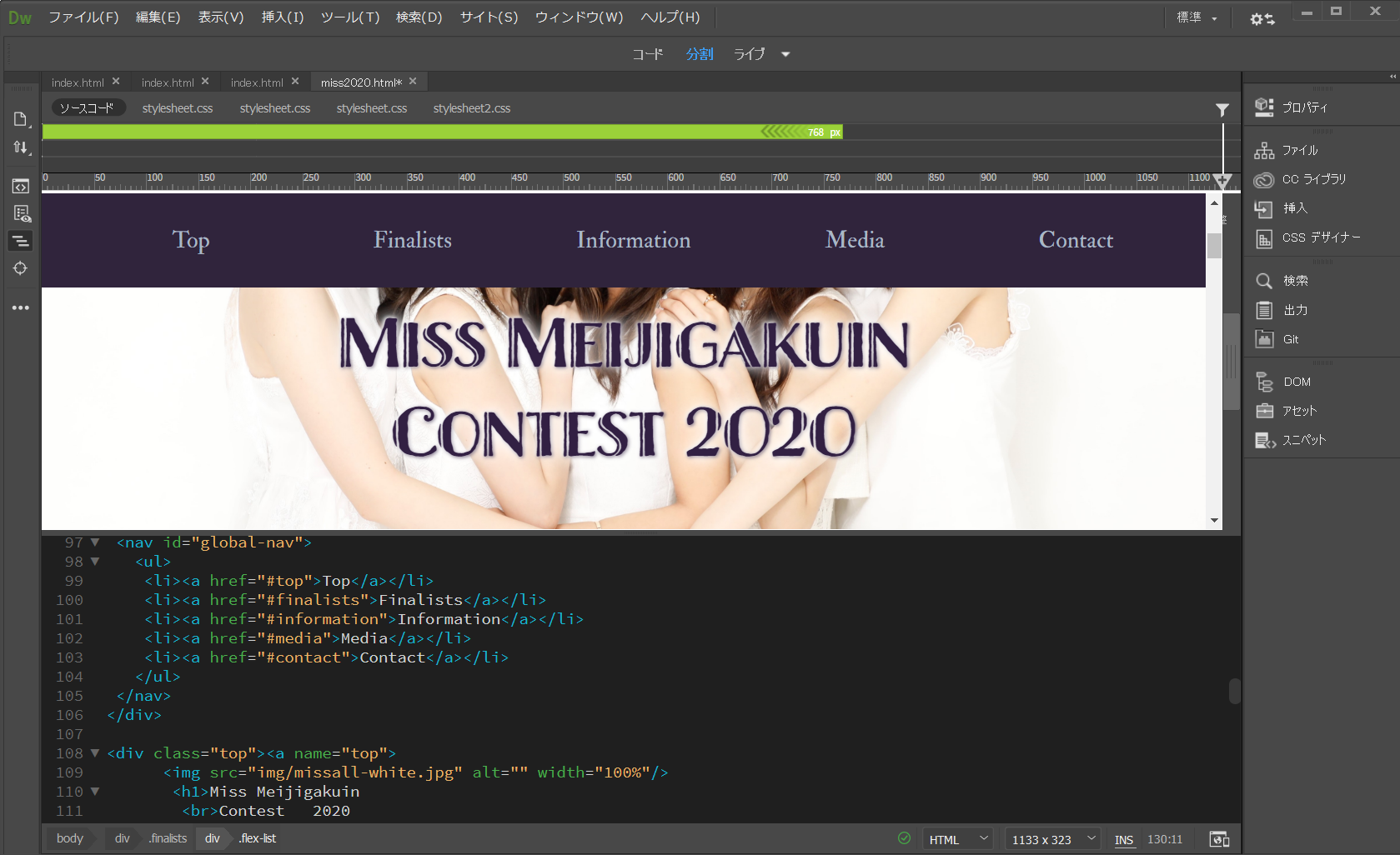 webは、AdobeのDreamweaverというソフトを用いて当会のホームページやイベントサイトの制作、ミスコンテストにおけるwebマガジンやインタビューなどの制作を担当しています。制作の過程で画像編集ソフトを使うこともあり、webサイトだけにとどまらず多岐にわたって制作を手掛けることができるのもwebの魅力です. 一緒に素敵なWEBサイトを制作しましょう!